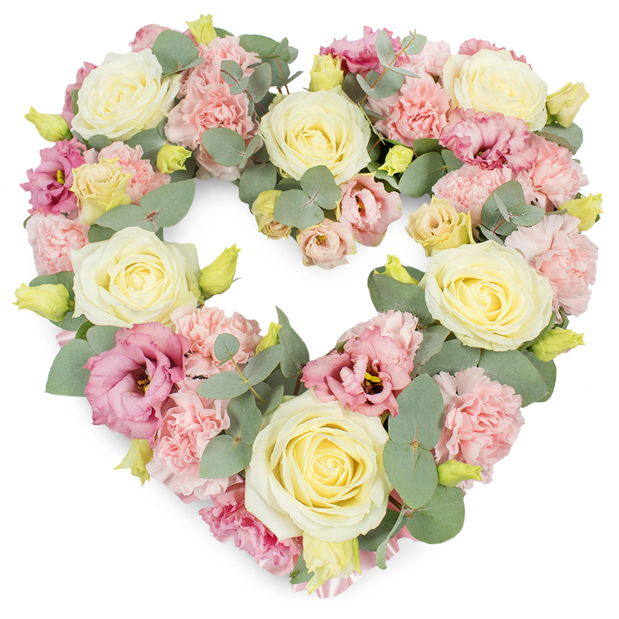 Convey your deepest emotions with our beautiful open heart tribute bouquet. This elegant arrangement includes hand-selected white roses, pink carnations, pink lisianthus, and lush eucalyptus leaves, meticulously crafted to symbolize love and remembrance.